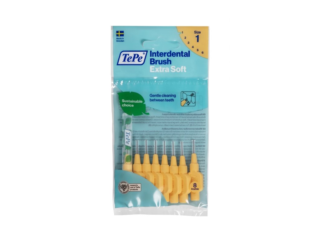 Mezizubní kartáčky TePe Extra Soft (8 ks) jsou navrženy pro šetrné a účinné čištění mezizubních prostor. Díky extra jemným vláknům čistí důkladně, aniž by dráždily dásně, a jsou ideální pro osoby s citlivými dásněmi či pro každodenní prevenci zubního kazu a zánětu dásní.